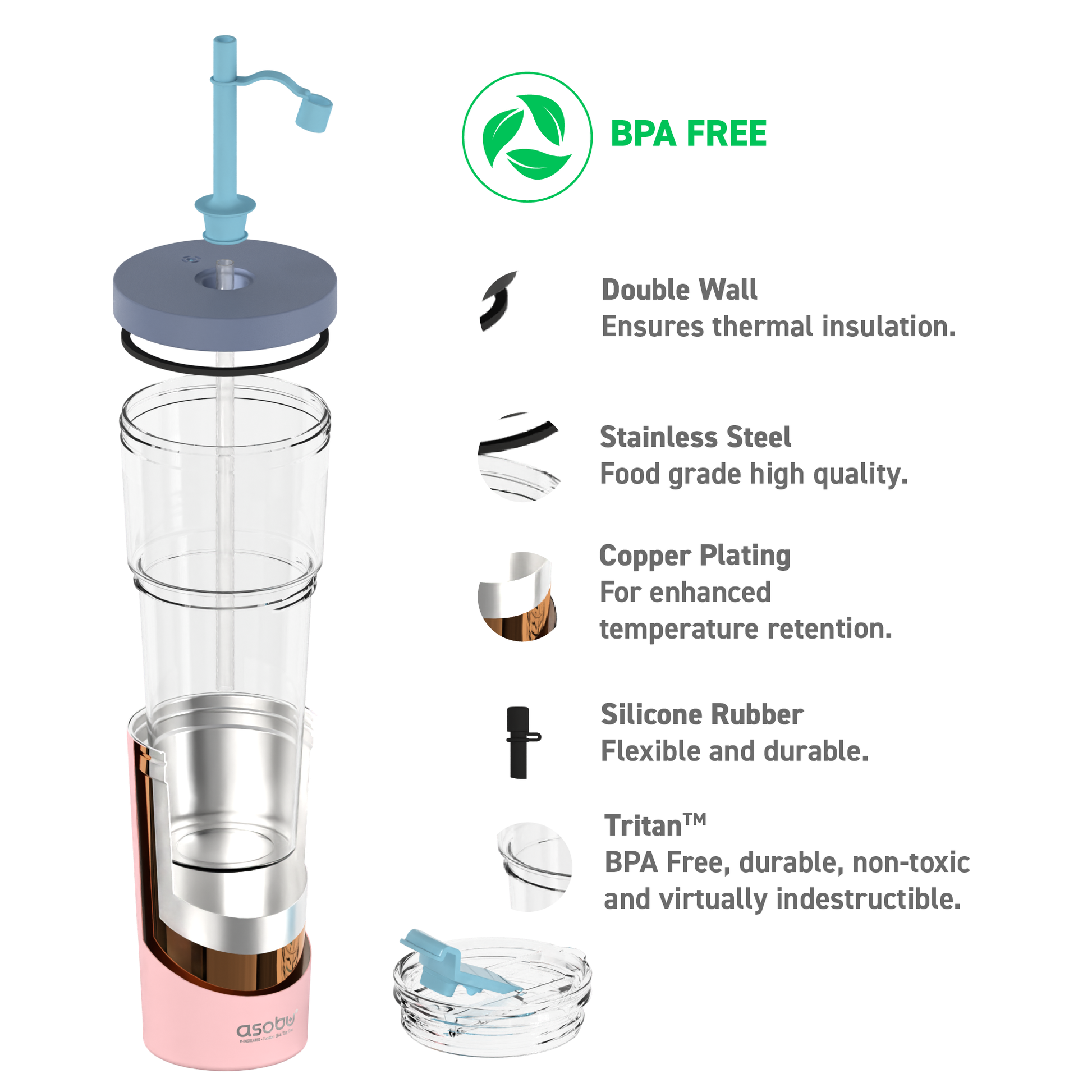Equipé d'une base en silicone antidérapante, d'une paille en silicone avec fermeture et d'un couvercle supplémentaire pour boissons chaudes, il assure un confort dans toutes les situations. La triple isolation – acier inoxydable, double paroi et couche de cuivre – maintient efficacement la température pendant de nombreuses heures, que vous preniez votre café du matin ou votre limonade rafraîchissante.